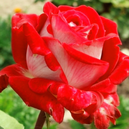 Кусты достигают в высоту 1 м. Состоят они из толстых и крепких побегов, с множеством небольших шипов. Листья среднего размера, темно-зеленые, с матовой поверхностью. Бутоны классической бокаловидной формы. Распустившись, они образуют пышные, махровые цветки, диаметром 9 см. Лепестки двухцветные – белые снаружи и насыщенно-красные по краям. Цветение обильное и продолжительное (весь сезон). Аромат тонкий и ненавязчивый.